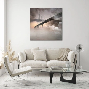 Glasbild - Bild auf glas - Eine Brücke im Nebel mit dramatischem Himmel und Tiefenperspektive - 50x70cm - Auf dem Fluss, den es nicht gibt - Moderne Wanddekoration für Wohnzimmer und Schlafzimmer ARTTOR