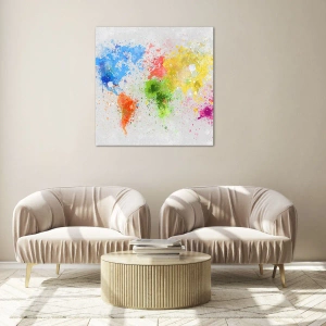 • Das Gemälde zeigt eine künstlerische Weltkarte, die mit abstrakten Farbspritztechniken erstellt wurde. Kräftige Farben vor einem hellen Hintergrund schaffen eine moderne und inspirierende Komposition.