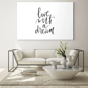Das „Zitat ‚Lebe mit einem Traum‘ in eleganter Kalligrafie“ ist das perfekte Angebot für Liebhaber von Minimalismus und motivierenden Dekorationen. Glasmalerei von ARTTOR bringt Inspiration, Eleganz und die subtile Schönheit der Typografie in Ihr Interieur.