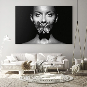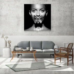 Glasbild - Bild auf glas - Porträt einer Frau mit einem Schmetterling auf den Lippen in Schwarzweiß - 50x70cm - Schmetterlingskuss - Moderne Wanddekoration für Wohnzimmer und Schlafzimmer ARTTOR
