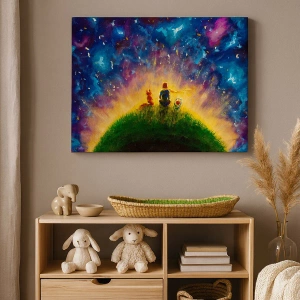 Die Leinwand wird über den Rahmen gespannt. Die Seiten und Kanten werden gedruckt, um das Bild fortzusetzen. Das Bild ist fertig zum Aufhängen an der Wand. Jedes Produkt hat einen am Rahmen befestigten Anhänger und ein Montageset (Schraube + Stift).