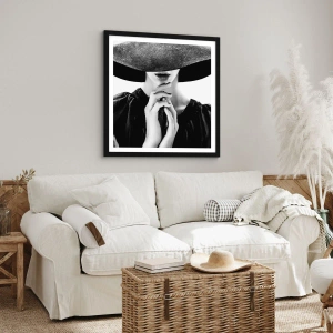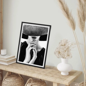 Poster in einem schwarzem Rahmen - Stilvolle Frau mit großem Hut in Schwarz-Weiß-Tönen - 70x50cm - Versteckte Schönheit - Moderne Wanddekoration für Wohnzimmer und Schlafzimmer ARTTOR
