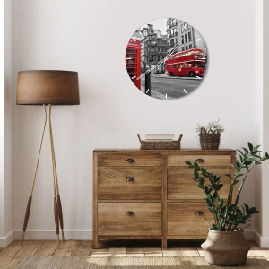 Wanduhr - Glasuhr - Eine rote Telefonzelle und ein Doppeldeckerbus in London mit der Stadt im Hintergrund - 30x30cm - Das Rotste in Europa - Moderne Wanddekoration für Wohnzimmer und Schlafzimmer ARTTOR
