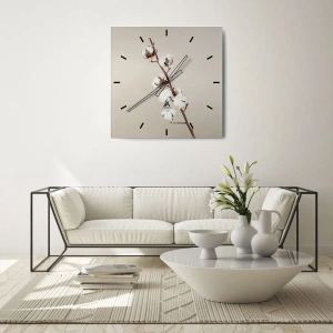 Wanduhr - Glasuhr - Ein Zweig Baumwolle auf beigem Hintergrund im minimalistischen Stil - 30x30cm - An der Quelle der Weichheit - Moderne Wanddekoration für Wohnzimmer, Küche und Schlafzimmer ARTTOR
