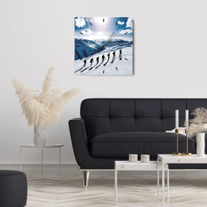 - Eine runde Uhr auf Glas im Format 30 x 30 cm, die eine Gruppe von Bergsteigern zeigt, die einen schneebedeckten Hang hinaufsteigen, umgeben von majestätischen Bergen und einem strahlenden Himmel.
