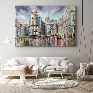 Bild auf Leinwand - Leinwandbild - Abendlicher Blick auf die Stadt mit Spiegelungen auf der nassen Straße - 50x70cm - Es wird ein gelungener Abend - Moderne Wanddekoration für Wohnzimmer und Schlafzimmer ARTTOR
