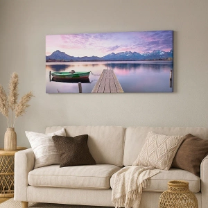 Bild auf Leinwand - Leinwandbild - Ein Holzsteg mit einem Boot auf einem von Bergen umgebenen See bei Sonnenuntergang - 50x70cm - Freundliche Stille - Moderne Wanddekoration für Wohnzimmer und Schlafzimmer ARTTOR