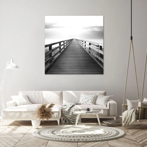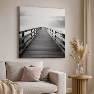 Bild auf Leinwand - Leinwandbild - Ein Schwarzweißbild eines Holzstegs, der zum Horizont führt. - 50x70cm - In die Ferne ... - Moderne Wanddekoration für Wohnzimmer und Schlafzimmer ARTTOR