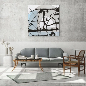 • Eine moderne Abstraktion mit dynamischen schwarzen Linien und blauen Spritzern. Ein faszinierendes Zusammenspiel von Kontrasten und geometrischen Formen. Perfekt für ein Wohnzimmer, Büro oder ein Interieur im minimalistischen oder künstlerischen Stil.