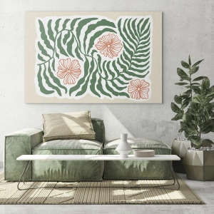 Glasbild - Bild auf glas - Grüne Blätter und rote Blüten in grafischer Anordnung - 50x70cm - Aufgeblüht in Grün - Moderne Wanddekoration für Wohnzimmer und Schlafzimmer ARTTOR