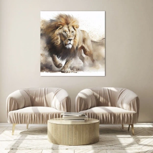 Glasbild - Bild auf glas - Eine dynamische Aufnahme eines laufenden Löwen im Aquarellstil - 50x70cm - Der König zog um - Moderne Wanddekoration für Wohnzimmer und Schlafzimmer ARTTOR