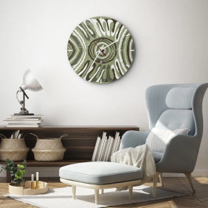 Wanduhr – Explosion der Emotionen – Symmetrische Komposition in Grün und Braun mit konzentrischen Mustern