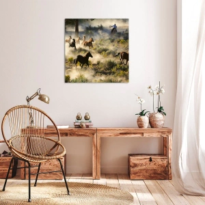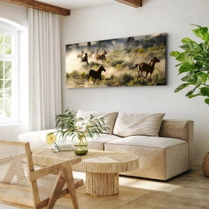 Bild auf Leinwand - Leinwandbild - Eine Herde wilder Pferde galoppiert durch Staub und Vegetation - 160x50cm - Rivalität – Freiheit oder männliche Stärke? - Moderne Wanddekoration für Wohnzimmer und Schlafzimmer ARTTOR