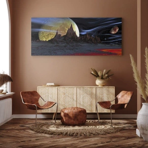 Bild auf Leinwand - Leinwandbild - Eine fantastische Landschaft mit Planeten und Vulkanen - 70x50cm - Unbekannte Welt - Moderne Wanddekoration für Wohnzimmer und Schlafzimmer ARTTOR