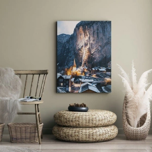 - Eine Winterlandschaft eines Dorfes, umgeben von majestätischen Bergen, beleuchtet von warmem Licht. Eine perfekte Dekoration für Liebhaber von Winterlandschaften.