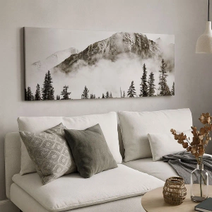 Bild auf Leinwand - Leinwandbild - Ein malerischer Berggipfel, umgeben von Nebel und einem sepiafarbenen Wald - 70x50cm - Lineal aus Granit - Moderne Wanddekoration für Wohnzimmer und Schlafzimmer ARTTOR