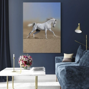 Der Hintergrund des Bildes ist in zarten Blau- und Beigetönen gehalten und bildet einen Kontrast zum Weiß des Pferdes, wodurch seine Einzigartigkeit noch weiter betont wird. Details wie die wallende Mähne und der unter den Hufen aufsteigende Staub verleihen der Szene Realismus und Bewegung.