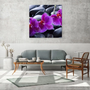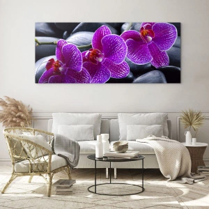 Glasbild - Bild auf glas - Lila Orchideen vor einem Hintergrund aus glatten Steinen - 100x70cm - Die Steine