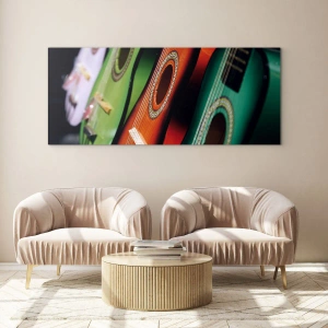 Glasbild - Bild auf glas - Bunte Gitarren in einer Reihe - 70x50cm - Die Gitarre hat viele Farben - Moderne Wanddekoration für Wohnzimmer und Schlafzimmer ARTTOR