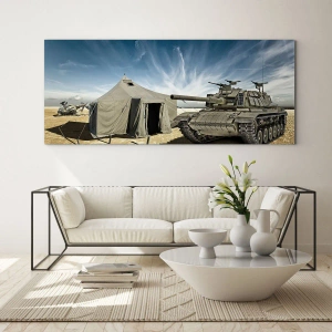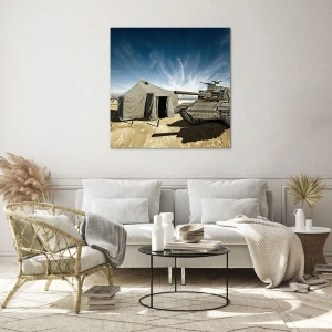Glasbild - Bild auf glas - Ein Panzer und ein Zelt vor einem Wüstenhintergrund unter blauem Himmel - 50x70cm - Ein militärischer Traum - Moderne Wanddekoration für Wohnzimmer und Schlafzimmer ARTTOR