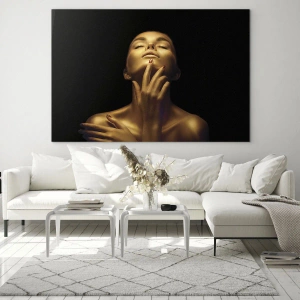 Glasbild - Bild auf glas - Porträt einer Frau in goldenen Farbtönen - 70x50cm - Wie goldene Seide - Moderne Wanddekoration für Wohnzimmer und Schlafzimmer ARTTOR