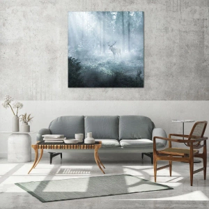 - Ein Hirsch steht im Waldnebel, beleuchtet von der Morgensonne. Diese stimmungsvolle, ruhige Komposition auf einem 70 x 50 cm großen horizontalen ARTTOR-Glasdruck eignet sich perfekt für von Natur und Minimalismus inspirierte Innenräume.