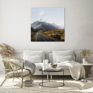 Glasbild - Bild auf glas - Eine Asphaltstraße, die zu den schneebedeckten Bergen führt - 50x70cm - Der Weg ins Herz der Berge - Moderne Wanddekoration für Wohnzimmer und Schlafzimmer ARTTOR