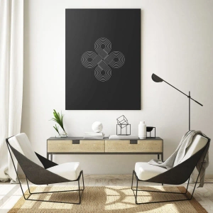 - Ein weißes, geometrisches keltisches Symbol, zentral platziert auf schwarzem Hintergrund. Dieser horizontale Glasdruck im Format 70 x 50 cm eignet sich perfekt für minimalistische und moderne Räume.