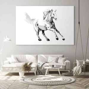 Glasbild - Bild auf glas - Schwarz-weiße Skizze eines galoppierenden Pferdes auf weißem Hintergrund - 50x70cm - Ungezähmte Seele - Moderne Wanddekoration für Wohnzimmer und Schlafzimmer ARTTOR