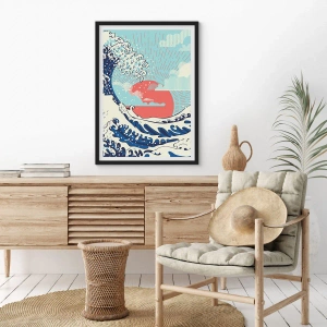 - Dieses Poster zeigt eine grafische, japanisch inspirierte Welle mit einer roten Sonne am Horizont. Es passt perfekt in moderne Innenräume. Inklusive schwarzem Rahmen und den Maßen 50 x 70 cm.