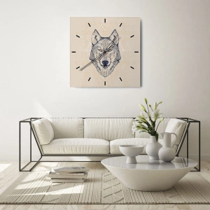 Wanduhr mit Wolfsmotiv auf beigem Hintergrund ist eine einzigartige Dekoration, die natürliche Ästhetik und modernes Design vereint. Die geometrischen Muster auf dem Hintergrund betonen die Originalität dieses Designs und verleihen ihm einen künstlerischen Ausdruck.