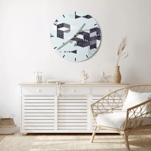 - Diese Wanduhr besticht durch ein einzigartiges geometrisches Muster auf weißem Zifferblatt. Perfekt für minimalistische oder moderne Innenräume. Die schwarzen Zeiger sorgen für Eleganz und Kontrast.