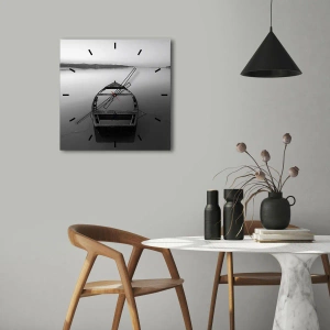 Wanduhr - Glasuhr - Ein einsames Boot auf einem ruhigen See in Schwarzweiß. - 30x30cm - Sehnsucht und Melancholie - Moderne Wanddekoration für Wohnzimmer, Küche und Schlafzimmer ARTTOR