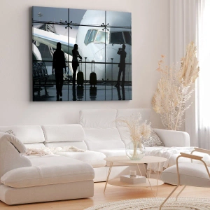 Bild auf Leinwand - Leinwandbild - Flughafen mit Silhouetten von Menschen und Blick auf das Flugzeug - 80x120cm - Vis a vis am Flughafen - Moderne Wanddekoration für Wohnzimmer und Schlafzimmer ARTTOR