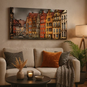 • Bunte Stadthäuser in einer historischen Stadt entlang einer Kopfsteinpflasterstraße. Ein Bild voller Atmosphäre und architektonischer Eleganz, perfekt für klassische Innenräume.