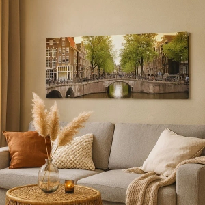 Bild auf Leinwand - Leinwandbild - Ein Kanal in Amsterdam, umgeben von historischen Mietshäusern - 50x70cm - Mit dem Boot oder mit dem Fahrrad? - Moderne Wanddekoration für Wohnzimmer und Schlafzimmer ARTTOR
