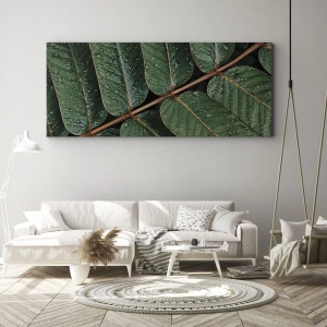 Bild auf Leinwand - Leinwandbild - Makroaufnahme von grünen Blättern mit Tautropfen - 50x70cm - Im grünen Rhythmus - Moderne Wanddekoration für Wohnzimmer und Schlafzimmer ARTTOR