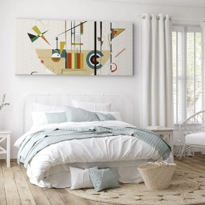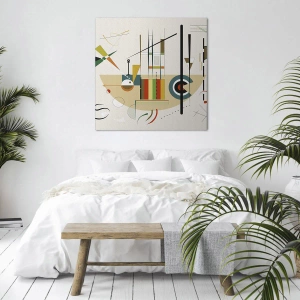 Die Komposition besteht aus verschiedenen geometrischen Elementen wie Kreisen, Linien und Dreiecken, die zu einem stimmigen Ganzen kombiniert wurden. Farben wie Gelb, Grün, Orange und Blau verleihen dem Gemälde einen fröhlichen und positiven Charakter und betonen gleichzeitig sein einzigartiges Design. Dies ist ein Gemälde, das Energie und Kreativität in den Innenraum bringt.