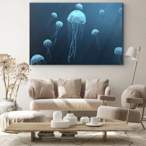 Bild auf Leinwand - Leinwandbild - Quallen schwimmen in den Tiefen des Ozeans in Blautönen - 50x70cm - Ozeantanz - Moderne Wanddekoration für Wohnzimmer und Schlafzimmer ARTTOR