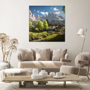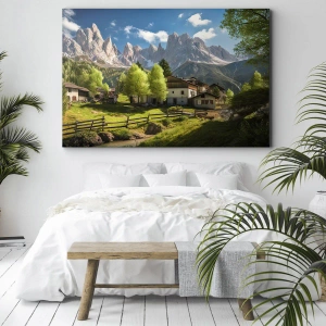 Bild auf Leinwand - Leinwandbild - Ein Bergdorf mit Häusern und Blick auf die Alpen - 80x120cm - Alpenidylle - Moderne Wanddekoration für Wohnzimmer und Schlafzimmer ARTTOR
