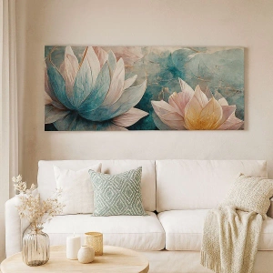 Die Leinwand wird über den Rahmen gespannt. Die Seiten und Kanten werden gedruckt, um das Bild fortzusetzen. Das Bild ist fertig zum Aufhängen an der Wand. Jedes Produkt hat einen am Rahmen befestigten Anhänger und ein Montageset (Schraube + Stift).