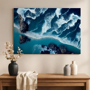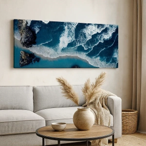 • Ein Gemälde, das aus der Vogelperspektive Meereswellen zeigt, die an die Küste schlagen. Eine dynamische und harmonische Landschaft, die Innenräumen Frische und Ruhe verleiht.