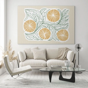 Glasbild - Bild auf glas - Orangefarbene Früchte und grüne Blätter in einer grafischen Komposition - 50x70cm - Ethnisch mit einem Hauch von Abstraktion - Moderne Wanddekoration für Wohnzimmer und Schlafzimmer ARTTOR