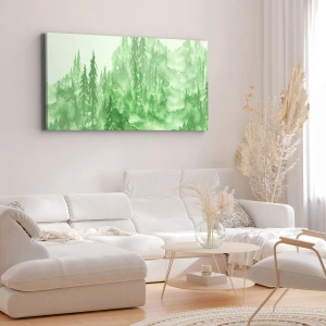 Bild auf Leinwand - Leinwandbild - Grüner Wald im Aquarellstil auf hellem Hintergrund - 140x50cm - Verschwommen mit grünem Nebel - Moderne Wanddekoration für Wohnzimmer und Schlafzimmer ARTTOR