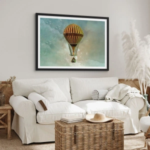 Poster in einem schwarzem Rahmen - Ein Heißluftballon, der zwischen den Wolken schwebt - 70x50cm - Pionierflüge - Moderne Wanddekoration für Wohnzimmer und Schlafzimmer ARTTOR