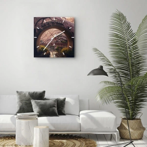 Wanduhr - Glasuhr - Blick durch das runde Tor auf die Kirschblütenbrücke im japanischen Stil - 30x30cm - Japanischer Frühling - Moderne Wanddekoration für Wohnzimmer, Küche und Schlafzimmer ARTTOR