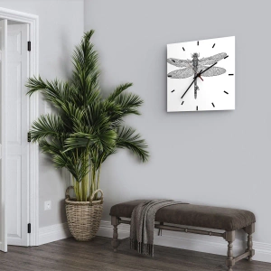 - Eine 30 x 30 cm große Wanduhr aus Glas mit einem präzisen, schwarz-weißen Libellendesign. Ein zartes und elegantes Dekorationsdesign, inspiriert von der Natur.