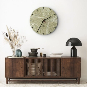 - Eine Wanduhr mit beigem Hintergrund und einem dezenten weißen Muster aus Linien und Bögen. Das moderne, grafische Design passt perfekt zu minimalistischen Innenräumen. Ein dezentes, elegantes Deko-Accessoire.