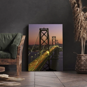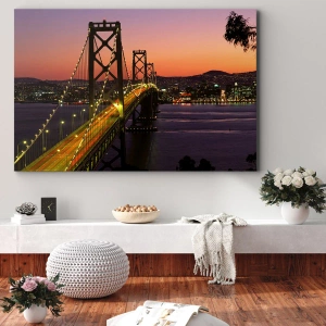 „Abend in Lila“ ist ein einzigartiges Leinwandbild, das eine majestätische, nachts beleuchtete Brücke zeigt, die sich über das ruhige Wasser eines Flusses erstreckt. Im Hintergrund ist das von Tausenden von Lichtern erleuchtete Stadtpanorama zu sehen, das einen unvergesslichen Anblick bietet. Die Farben des Sonnenuntergangs verleihen der Szene einen warmen, stimmungsvollen Charakter, der den Blick auf sich zieht und dem Raum eine romantische Atmosphäre verleiht.
