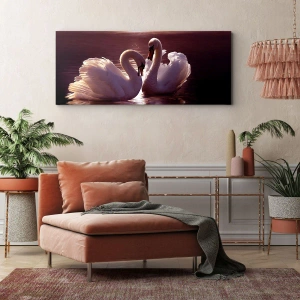- Ein romantischer Blick auf zwei Schwäne auf einem See bei Sonnenuntergang. Dieses Bild ist voller Harmonie, Ruhe und Eleganz und passt perfekt zu stilvollen, von der Natur inspirierten Innenräumen.